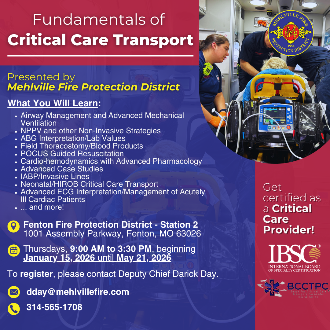 The Mehlville Fire Protection District is proud to offer the Fundamentals of Critical Care Transport course, designed to prepare healthcare professionals for the challenges of transporting critically ill patients. This comprehensive course provides hands-on training and advanced education to enhance the skills needed for managing complex medical emergencies in dynamic environments.