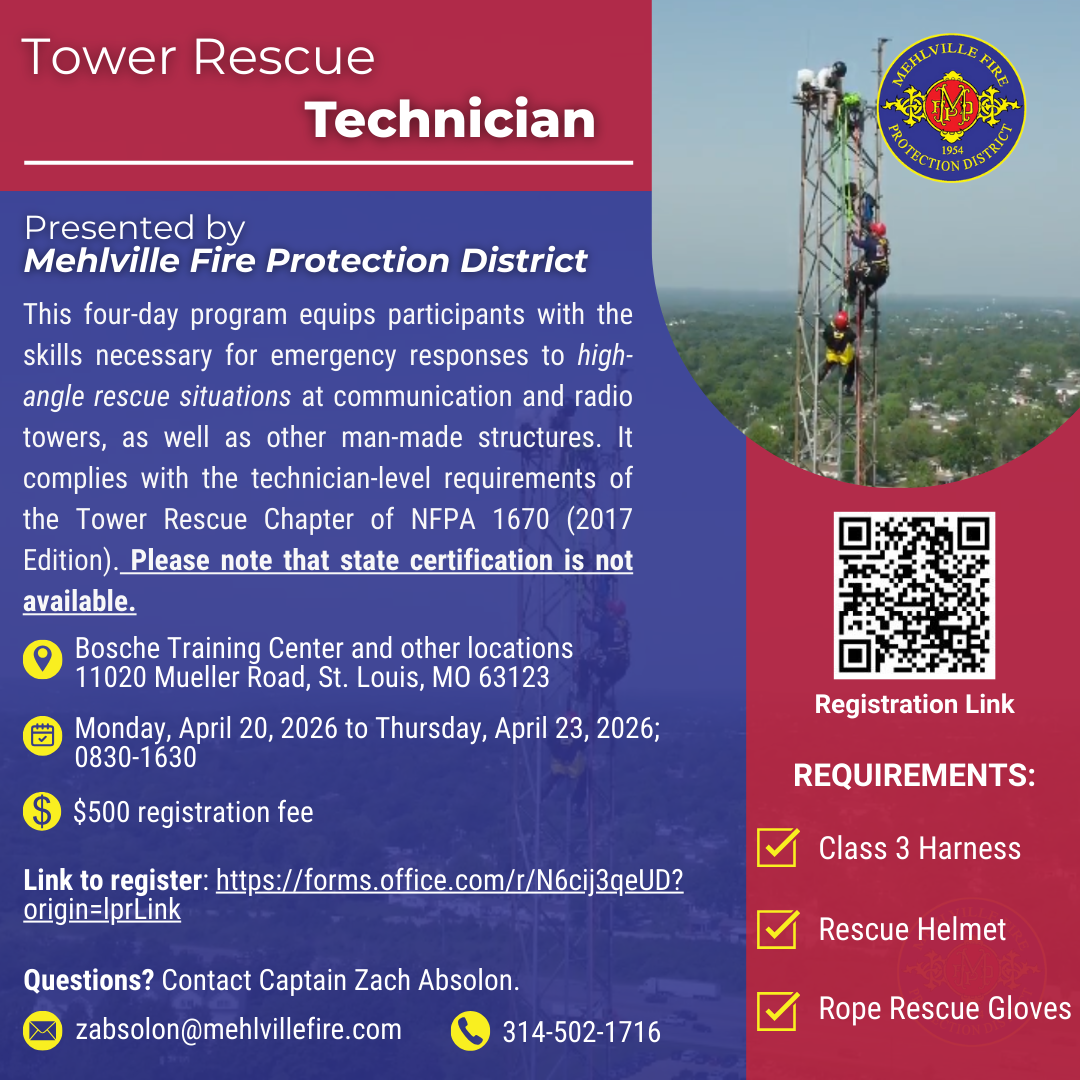 All instruction is delivered by Mehlville Fire Protection District personnel who are experienced and certified Tower Rescue Technicians, bringing real-world incident experience and a strong safety culture to every evolution.